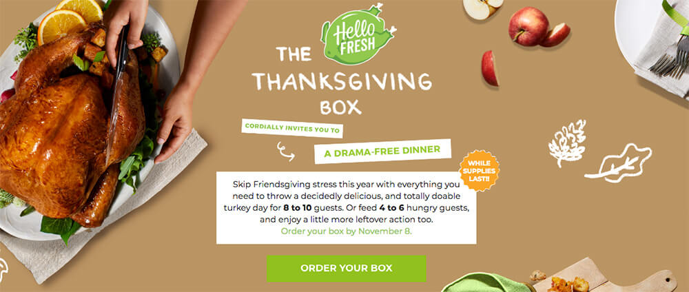 HelloFreshs Thanksgiving Feast Returns Photo. There is a shortage of turkeys 16 pounds and under. HelloFresh is offering its Thanksgiving Box meal kit for eight to 10 guests for order through Saturday Nov. HelloFresh the worlds leading meal kit company is bringing back its annual Thanksgiving Feast providing a delicious stress-free way to celebrate everyones favorite holiday together.